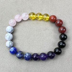 The seven chakras are energy centers in the body, each associated with specific crystals. The Root Chakra (red stones like garnet) promotes grounding. The Sacral Chakra (orange stones like carnelian) enhances creativity. The Solar Plexus Chakra (yellow stones like citrine) boosts confidence. The Heart Chakra (green or pink stones like rose quartz) fosters love. The Throat Chakra (blue stones like lapis lazuli) aids communication. The Third Eye Chakra (indigo stones like amethyst) sharpens intuition. The Crown Chakra (violet or clear stones like clear quartz) connects to spirituality. Crystal bracelets with these stones can balance chakras for overall well-being.